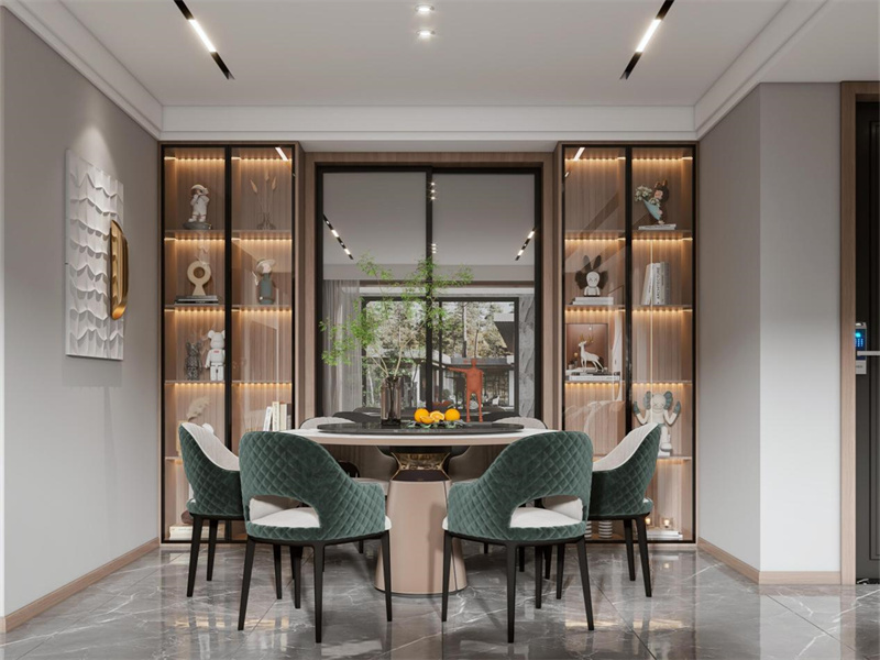 餐厅是通透轻奢+展示型收纳的设计,两侧做玻璃门展示柜,内嵌灯光展示藏品,既延伸空间视觉,又提升精致度。餐桌选圆形款,搭配墨绿色绒面椅,用高饱和色彩点亮空间。