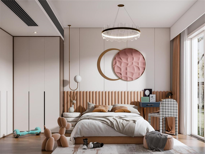 以低饱和奶油色为基底,用竖向格栅床头+粉色立体装饰画强化柔和氛围,同时加入黑白棋盘格座椅、金属线条吊灯等精致元素,平衡童趣与轻奢质感。