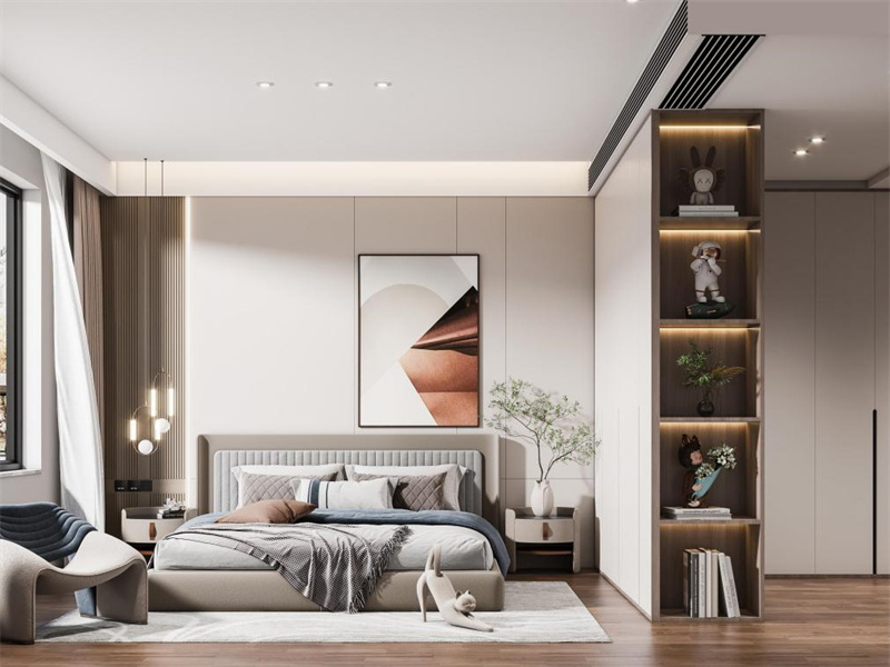 整墙定制柜嵌入开放格,用内嵌灯光展示藏品,床头背景墙做分块柔光板,搭配低饱和艺术画,弱化立面单调感。 多层次布局,暖光营造静谧氛围。