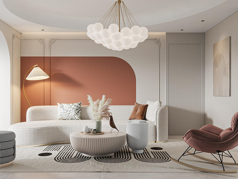 茶几:茶几通常摆放在沙发的前方,同时可以在沙发旁边摆放边桌等,方便临时放置饮品等。